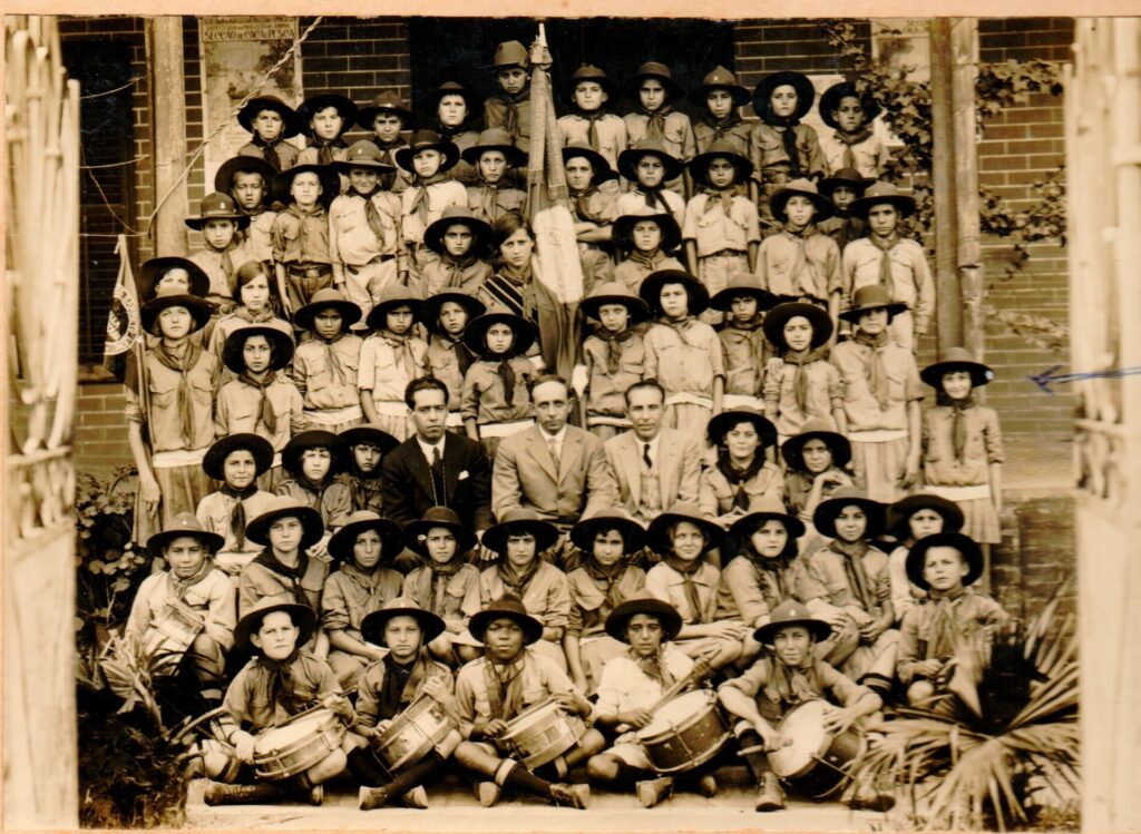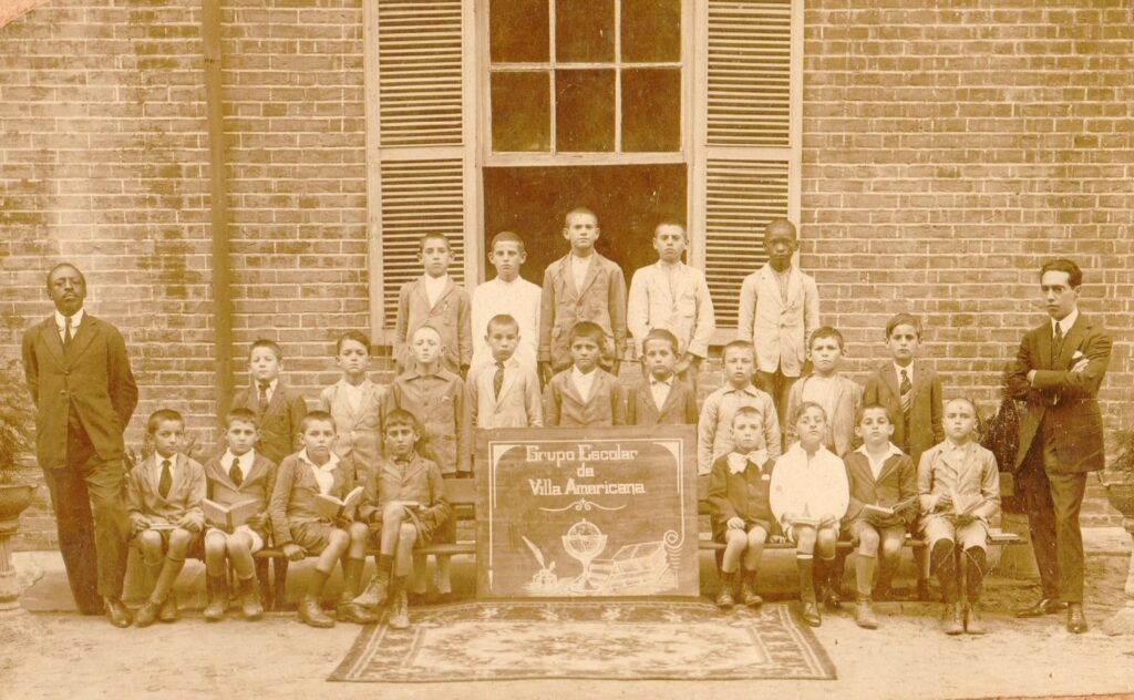 Dois daqueles personagens da foto, Oswaldo Paciulli e Zizo Fortunato, são amigos até hoje. Ali, garotos, estão juntos à professora Edwiges Tomazi e ao diretor Alcindo Soares do Nascimento. O cenário é o Primeiro Grupo Escolar “Dr. Heitor Penteado”, no prédio de sua primeira morada, em frente à Praça Comendador Müller, por volta de 1940.